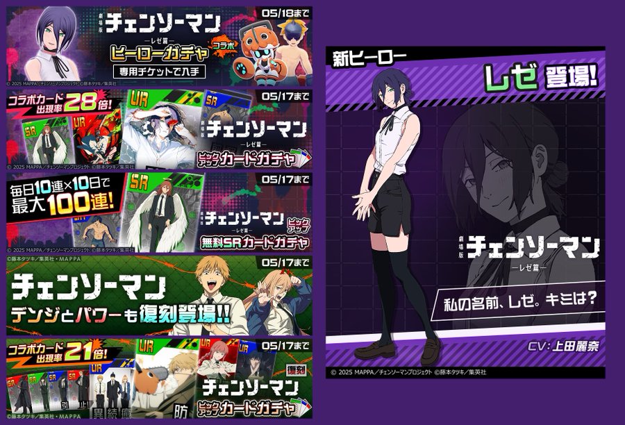 劇場版「チェンソーマン レゼ篇」とのコラボが決定。新コラボヒーローとしてレゼが登場しています。