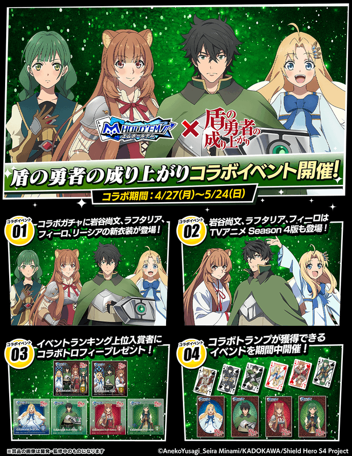 新衣装の岩谷尚文、ラフタリア、フィーロ、リーシアがコラボガチャに登場しています。