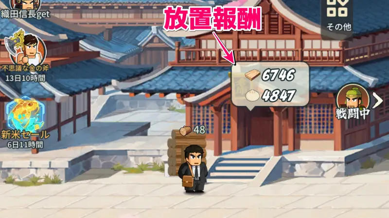 育成パートもオフライン収益がもらえるので、ゲームタイトルの「毎日5分!伐採から天下統一」というのは偽りではありません。