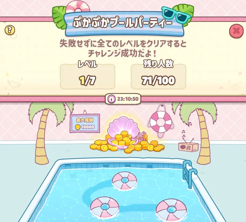 みんなで挑む「チーム戦」や、7レベルクリアで大量のコインをGETできる「ぷかぷかプールパーティー」など、イベント内容もお手軽さに特化しています。