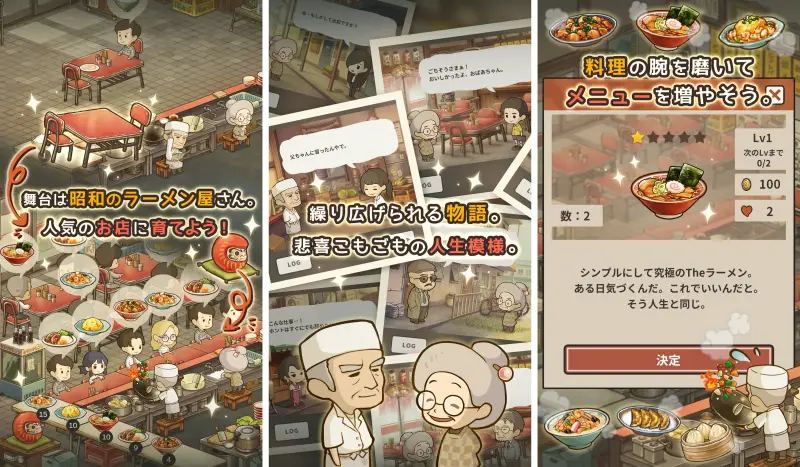 『思い出のラーメン食堂』は、おじいさんとおばあさんが二人三脚で営む小さなラーメン屋を舞台にしたお店育成シミュレーションゲームです。