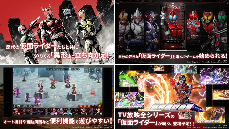 初代「仮面ライダー」から「仮面ライダーガヴ」まで、歴代の仮面ライダーたち勢揃いで楽しめるタワーディフェンスゲーム。チュートリアルクリアで好きなライダーがもらえるので、自分の世代のライダーで物語を進められます!